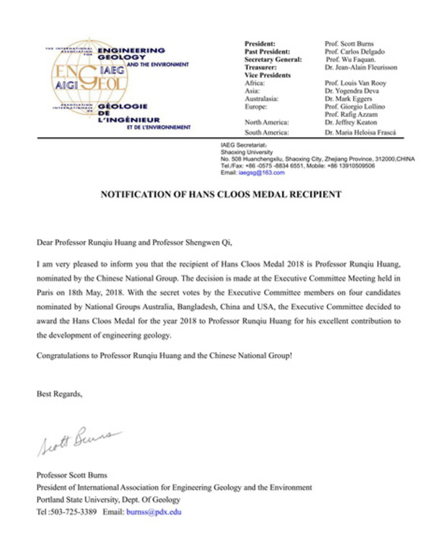 国际工程地质与环境协会(IAEG)执委会5月18日在法国巴黎召开全体执委会会议,经秘密投票表决,九三学社中央副主席、IAEG原副主席黄润秋获得2018年国际工程地质与环境协会(IAEG)学术终身成就奖Hans Cloos Medal。