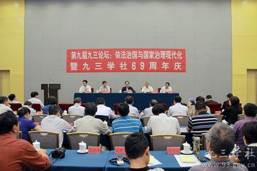 为迎接即将召开的中共十八届四中全会,在首个“中国人民抗日战争胜利纪念日”和九三学社成立69年纪念日之际,九三学社中央9月3日在京举办第九届“九三论坛”,专题研讨“依法治国与国家治理现代化”。全国政协副主席、九三学社中央主席韩启德作开幕讲话。论坛由九三学社中央常务副主席邵鸿主持。九三学社中央副主席赖明、丛斌出席论坛。