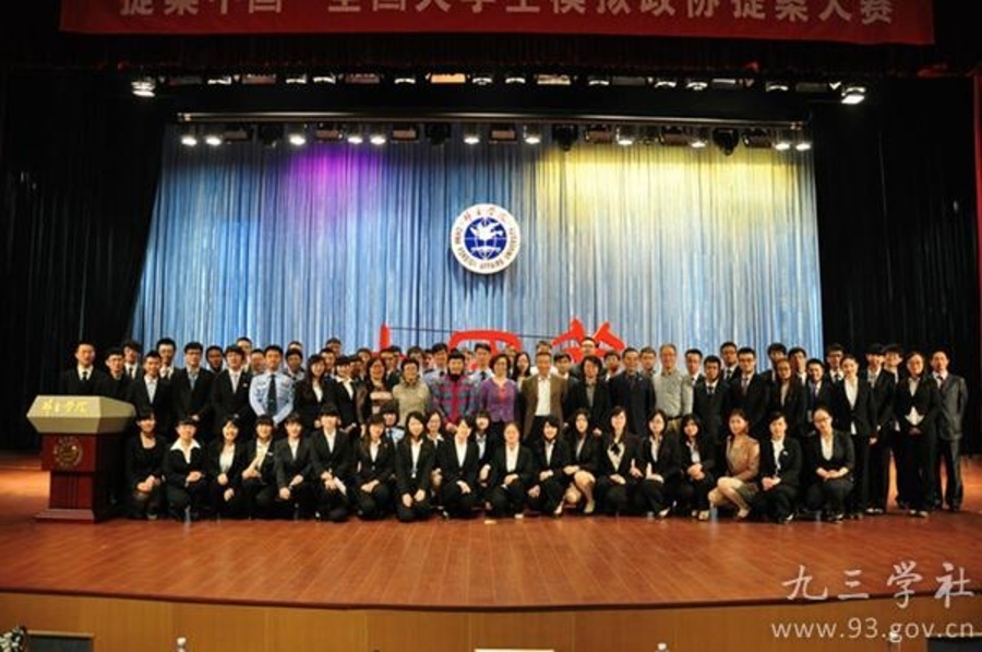 5月4号下午,以全国政协副秘书长、九三学社中央常务副主席邵鸿为首的10余位全国政协委员与外交学院、中国人民大学、对外经贸大学、北京交通大学、中央财经大学、国际关系学院、北京第二外国语大学、中央民族大学、北京外国语大学、北京航空航天大学等各大学代表队齐聚一堂,出席由外交学院主办、九三学社中央研究室提供支持的“提案中国”全国大学生模拟全国政协提案大赛正式启动。
