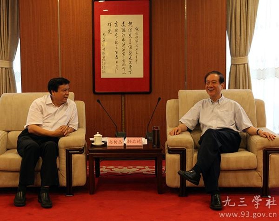 7月2日,全国政协副主席、九三学社中央主席韩启德在九三学社中央机关会见国家林业局局长赵树丛一行。九三学社中央常务副主席邵鸿,副主席兼秘书长印红参加会见。