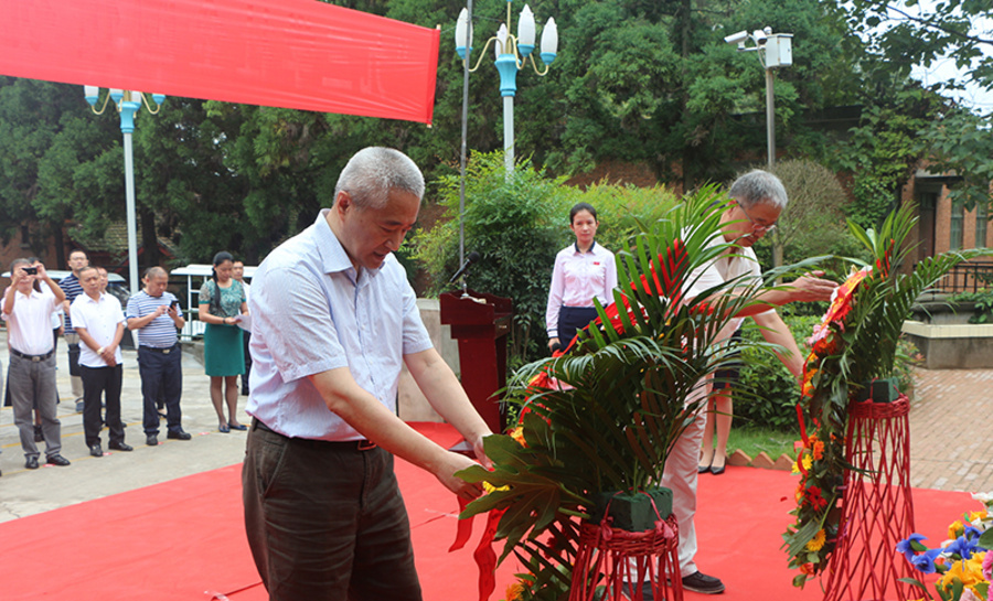 在红砖砌就的简朴小楼前,鲜花围绕着邓稼先先生爽朗微笑的铜像。邵鸿代表九三学社中央敬献花篮,并整理写有“邓稼先同志永垂不朽”的缎带;许进代表邓稼先夫人许鹿希女士及全体亲属敬献花篮,并整理写有“稼先我们永远怀念你”的缎带。出席仪式的全体人员向邓稼先铜像三鞠躬,以寄托九三学社社员及“两弹城”工作人员对“两弹一星”元勋邓稼先的哀思与崇敬。