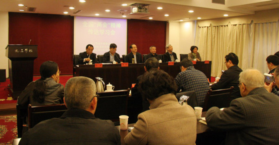 3月19日下午,九三学社中央与九三学社北京市委在京联合召开全国“两会”精神传达学习会。全国政协副主席、九三学社中央主席韩启德出席会议并讲话。九三学社中央副主席赖明、丛斌分别传达全国政协十二届一次会议和十二届全国人大一次会议精神。九三学社中央常务副主席邵鸿,副主席马大龙出席会议。九三学社中央副主席兼秘书长印红主持会议。