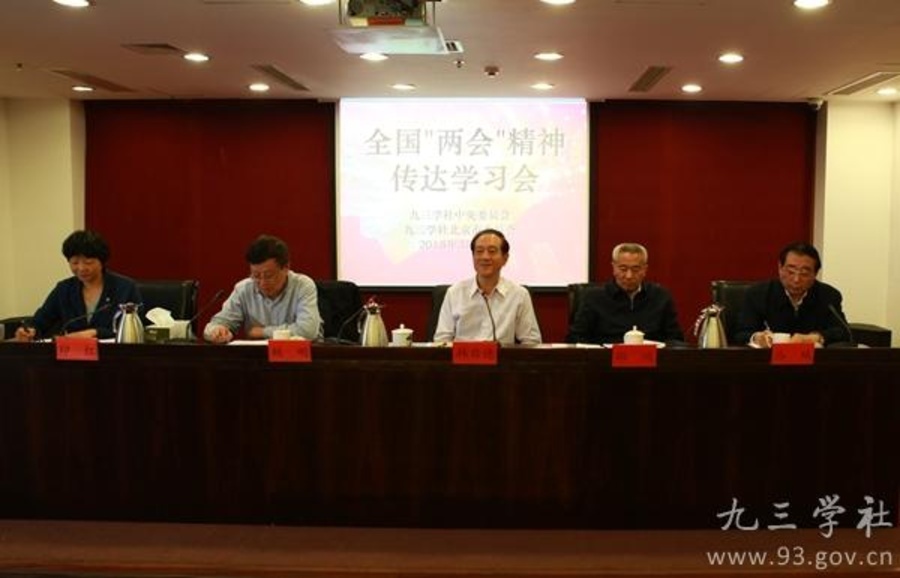 九三学社中央与九三学社北京市委3月16日下午在京联合召开全国“两会”精神传达学习会。全国政协副主席、九三学社中央主席韩启德出席会议并讲话。九三学社中央常务副主席邵鸿出席会议。九三学社中央副主席赖明、丛斌分别传达全国政协十二届三次会议和十二届全国人大三次会议精神。九三学社中央副主席兼秘书长印红主持会议。