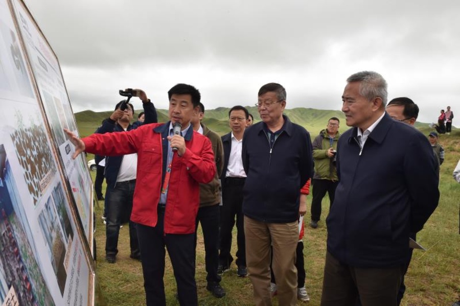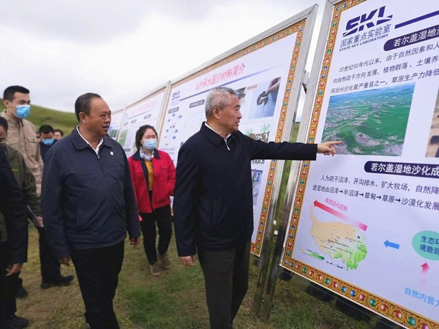8月7日,围绕黄河上游川甘青水源涵养区生态保护和高质量发展这一主题,邵鸿一行在四川省政协副主席杜和平陪同下在阿坝州开展调研。调研组实地考察了若尔盖县唐克镇黄河上游水利灾害点、若尔盖县“SJ”双聚有机物—生物屏障治沙实验示范项目,了解白河社区集体经济发展及文创旅游产品开发情况,瞻仰了巴西镇班佑“胜利曙光”纪念碑。