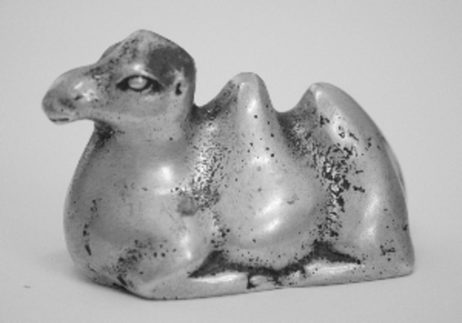 启功的书架上,摆放着他日常写字作画常用的两件心爱的镇纸:一件是卧姿的小铜骆驼,如鸭蛋大小,造型逼真;另一件是比小铜骆驼略大一倍的石质龟形镇纸。每当启功挥毫作书时,这两个镇纸就游移在纸上,助先生创作。由于小骆驼造型逼真、乖巧,得到启功的钟爱,在不写字时也常常拿在手中把玩,有诗铭记:“镇纸小铜骆驼,数年朝夕摩挲。静伏金光满屋,助我含笑高歌。”