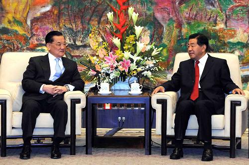 12月19日,中共中央政治局常委、全国政协主席贾庆林在上海会见中国国民党荣誉主席连战。 新华社记者 李学仁 摄