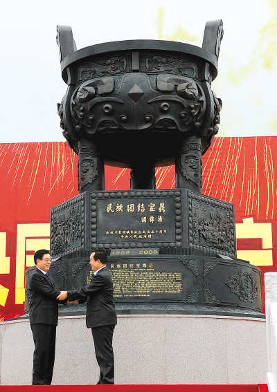 九月二十二日下午,由胡锦涛总书记亲笔题写鼎名的“民族团结宝鼎”赠鼎仪式在宁夏博物馆宝鼎广场举行。这是中共中央政治局常委、中央纪委书记、中央代表团团长贺国强(左)和宁夏回族自治区党委书记陈建国为宝鼎揭幕后握手。