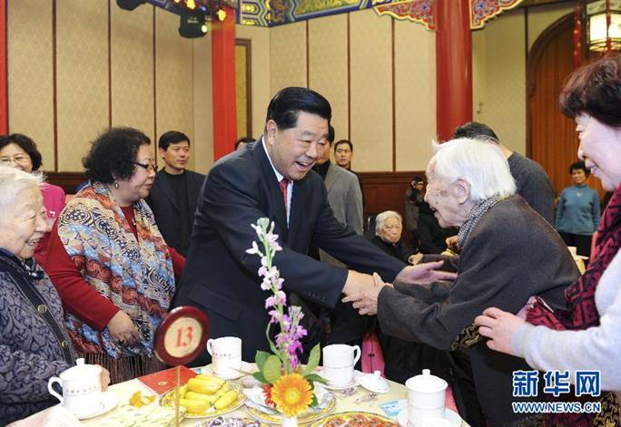 1月10日,全国政协在北京举行春节茶话会,邀请部分已故党外全国政协委员、知名人士夫人欢聚一堂,共迎佳节。中共中央政治局常委、全国政协主席贾庆林出席茶话会。这是贾庆林向老同志致以节日的问候。新华社记者 王晔 摄
