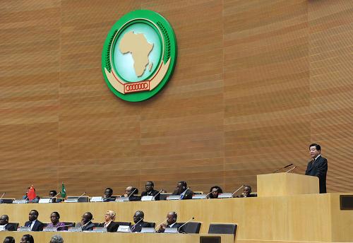 1月28日,全国政协主席贾庆林在亚的斯亚贝巴出席中国援建非盟会议中心落成典礼并致辞。新华社记者 饶爱民 摄