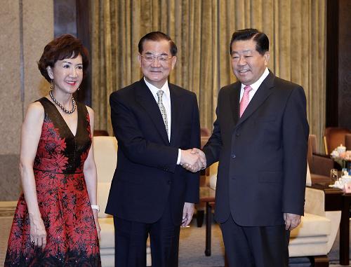 9月9日,中共中央政治局常委、全国政协主席贾庆林在上海会见中国国民党荣誉主席连战和夫人以及出席台胞社团论坛的部分代表。 新华社记者 刘建生 摄