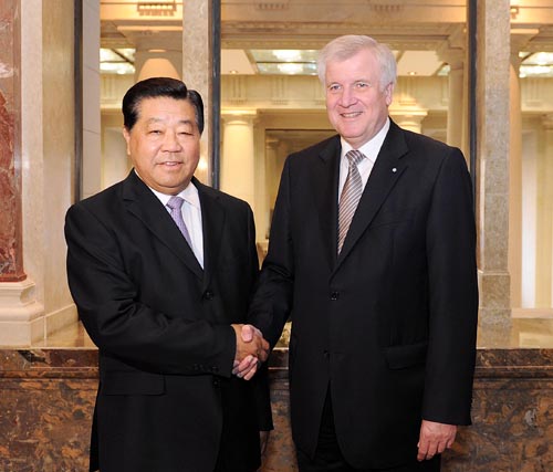 贾庆林首先转达了吴邦国委员长的亲切问候和祝愿,并代表中国全国政协祝贺泽霍费尔就任联邦参议长。他说,泽霍费尔先生现在身兼德国基社盟主席、巴伐利亚州州长和联邦参议长三职,在就任参议长第四天就接待中国代表团,体现了对发展对华关系的重视,对此表示赞赏。贾庆林说,当前中德关系发展良好。两国高层接触频繁,政治互信不断增强,合作应对国际金融危机取得显著成果。今年6月,温家宝总理与默克尔总理在柏林共同主持首轮中德政府磋商,就深化两国各领域互利合作达成诸多重要共识。双方在财政、农业、环保、科技、教育、文化等广泛领域开展了卓有成效的交流与合作,在国际及地区事务中也保持着密切的沟通与协调。中德关系已成为中欧关系的领跑者。