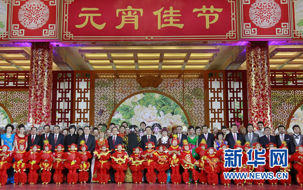 2月6日,中共中央在北京人民大会堂举行元宵节联欢晚会。这是演出结束时,党和国家领导人胡锦涛、吴邦国、温家宝、贾庆林、李长春、习近平、李克强、贺国强等走上舞台,同演职人员合影。新华社记者鞠鹏摄