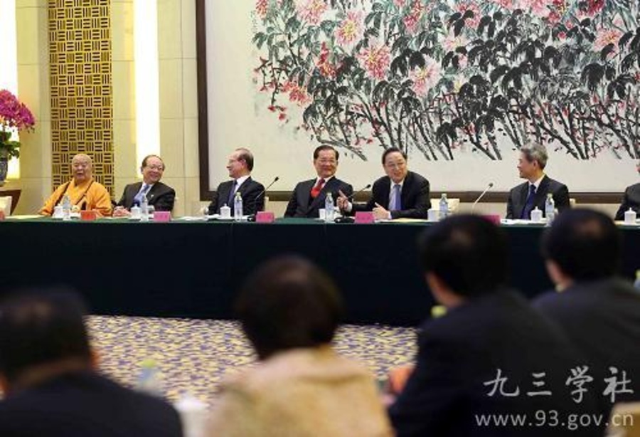 2月19日,中共中央政治局常委、全国政协主席俞正声同中国国民党荣誉主席连战一起出席两岸各界人士座谈会并发表讲话。新华社记者 刘卫兵 摄