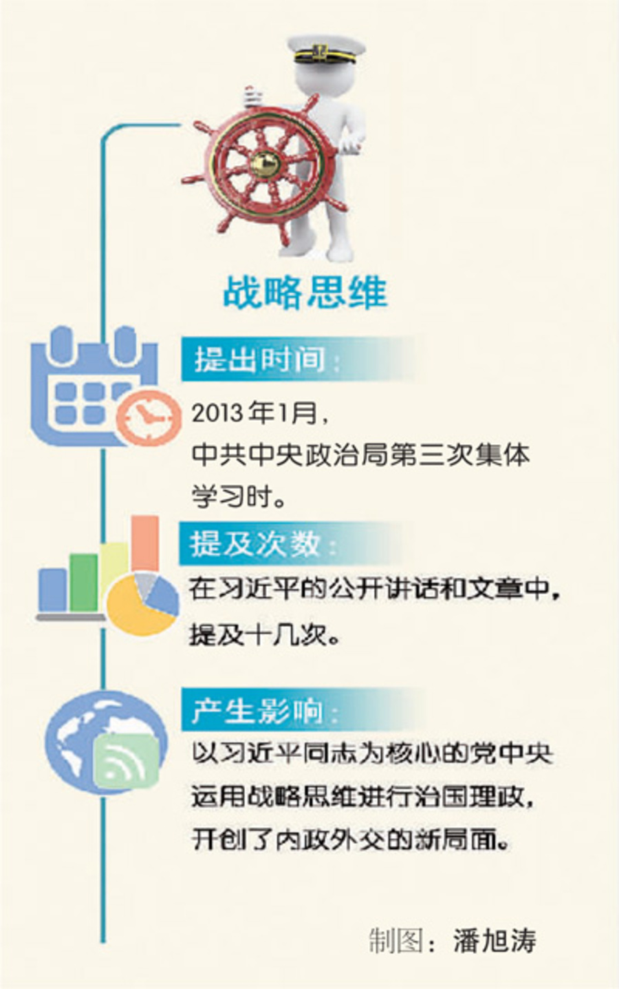 2013年1月,中共中央政治局就坚定不移走和平发展道路进行第三次集体学习,习近平总书记在主持学习时提到战略思维一词。这是中共十八大以来,习近平在公开讲话中首次提及战略思维。