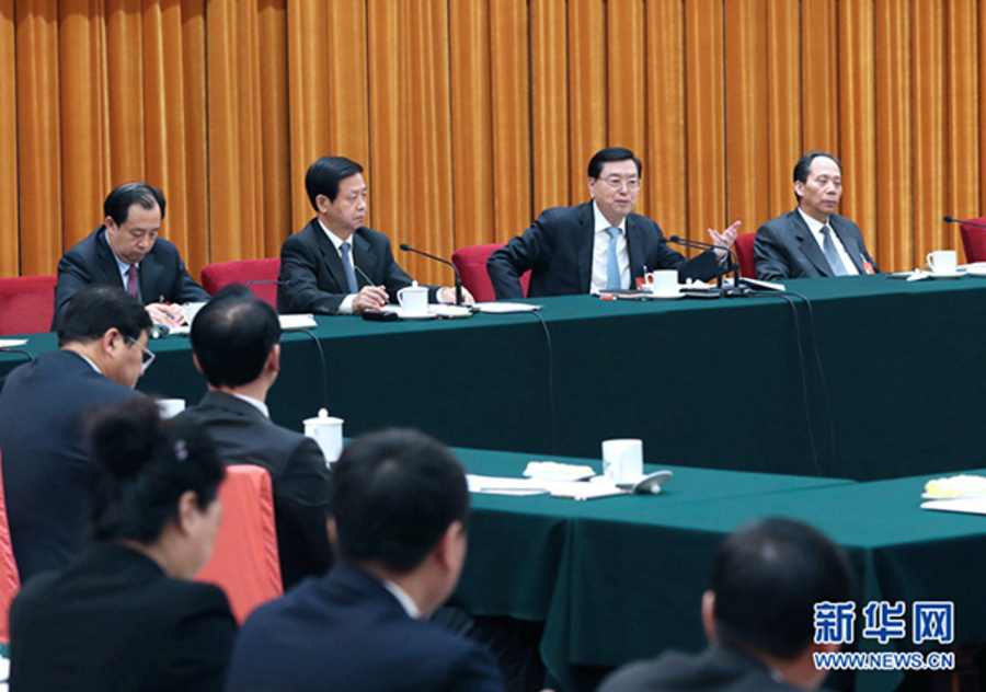 3月8日,中共中央政治局常委、全国人大常委会委员长张德江参加十二届全国人大五次会议黑龙江代表团的审议。新华社记者马占成摄