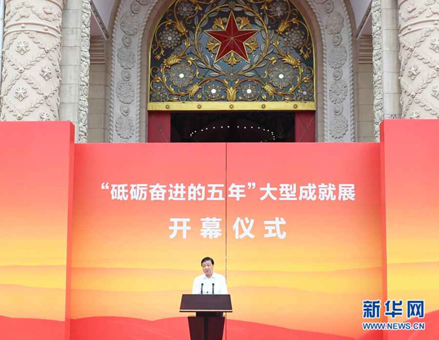 9月25日,“砥砺奋进的五年”大型成就展开幕式在北京展览馆举行。中共中央政治局常委、中央书记处书记刘云山发表讲话并宣布展览开幕。新华社记者张铎摄