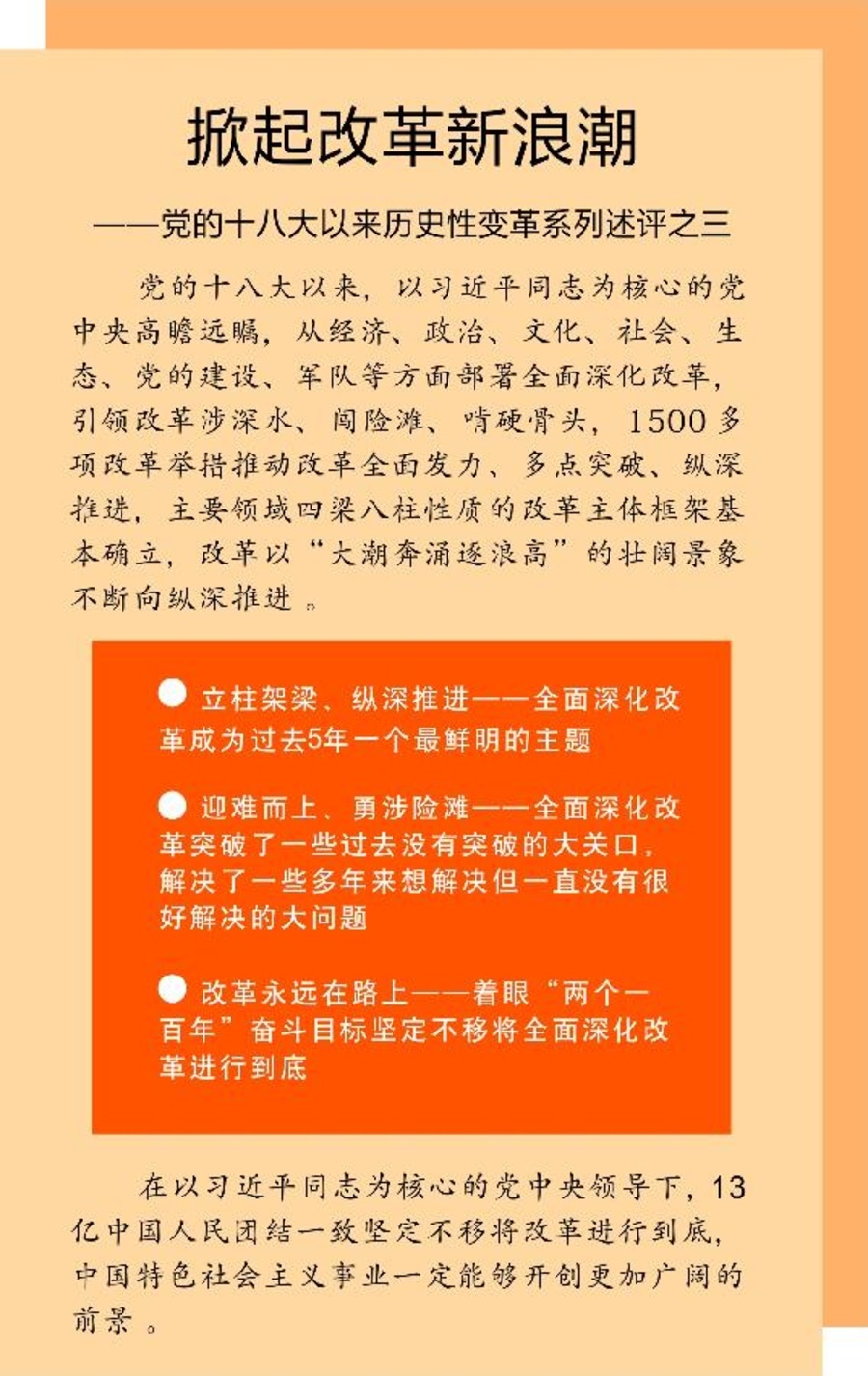 5年来,党中央以“咬定青山不放松”的精神将各项改革任务全面推开,使改革大潮席卷神州大地。