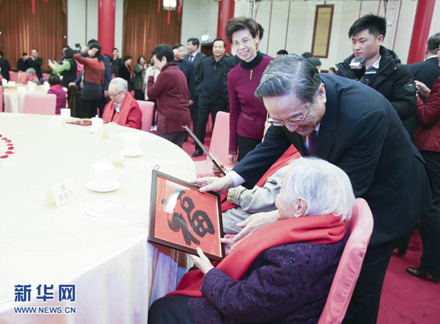2月1日,全国政协在北京政协礼堂举行已故知名人士的夫人2018年春节茶话会,大家欢聚一堂,畅叙友情,共贺新春。全国政协主席俞正声出席茶话会。这是俞正声向已故知名人士的夫人赠送“福”字。新华社记者姚大伟摄