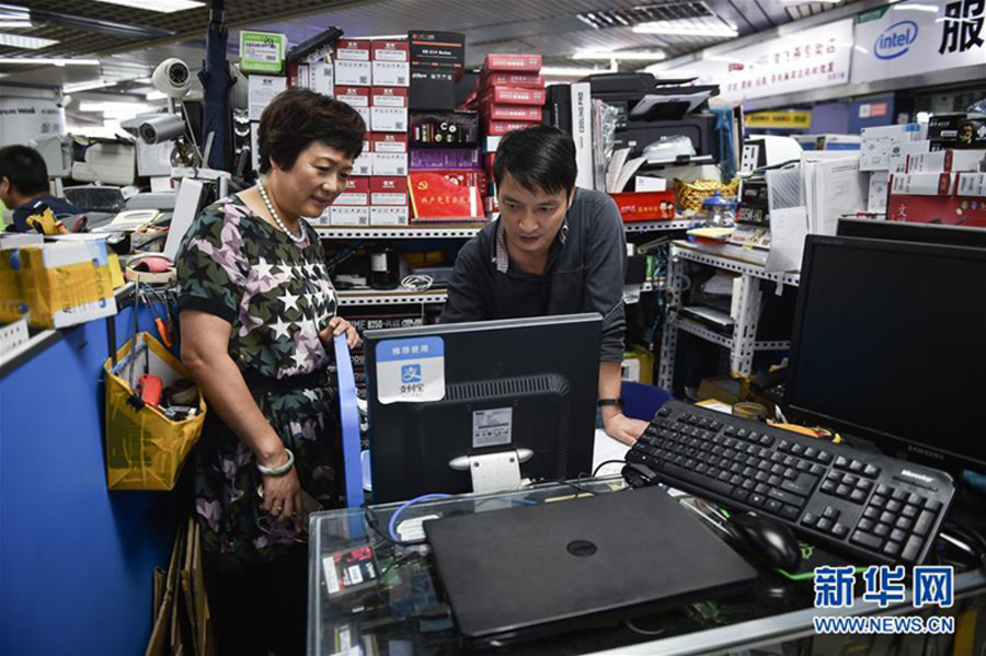 倪海真(左)到深圳华强北赛格电子市场五层的支部宣传委员陈亚林柜台前,与他沟通近期支部党员学习的情况(2017年9月5日摄)。新华社记者毛思倩摄