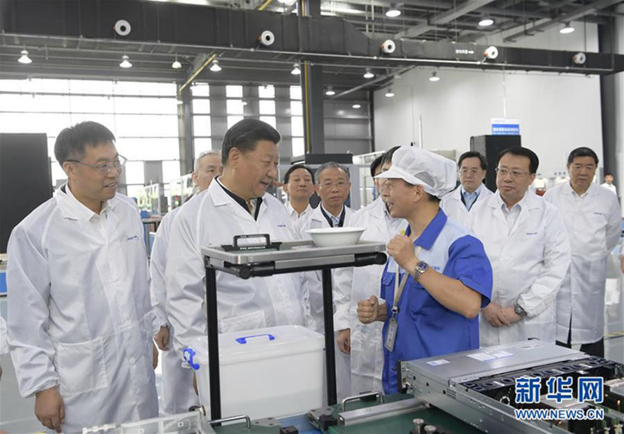14日上午,习近平来到济南高新区,考察浪潮集团高端容错计算机生产基地。近年来,浪潮集团实施创新驱动发展战略,加快高端服务器国产化替代,有效推动了数字经济和新旧动能转换。习近平结合实物详细了解企业自主研发的高端服务器和大数据、政务云、智慧城市等信息化平台,走进车间察看高端服务器装配生产线,听取企业运用“互联网+”理念打造智能工厂、提高产品质量和生产效率、弘扬“工匠精神”、提高企业竞争力等情况介绍。习近平强调,一个国家要发展,明确目标和路径很重要。我们的目标就是实现中华民族伟大复兴的中国梦。创新发展、新旧动能转换,是我们能否过坎的关键。要坚持把发展基点放在创新上,发挥我国社会主义制度能够集中力量办大事的制度优势,大力培育创新优势企业,塑造更多依靠创新驱动、更多发挥先发优势的引领型发展。