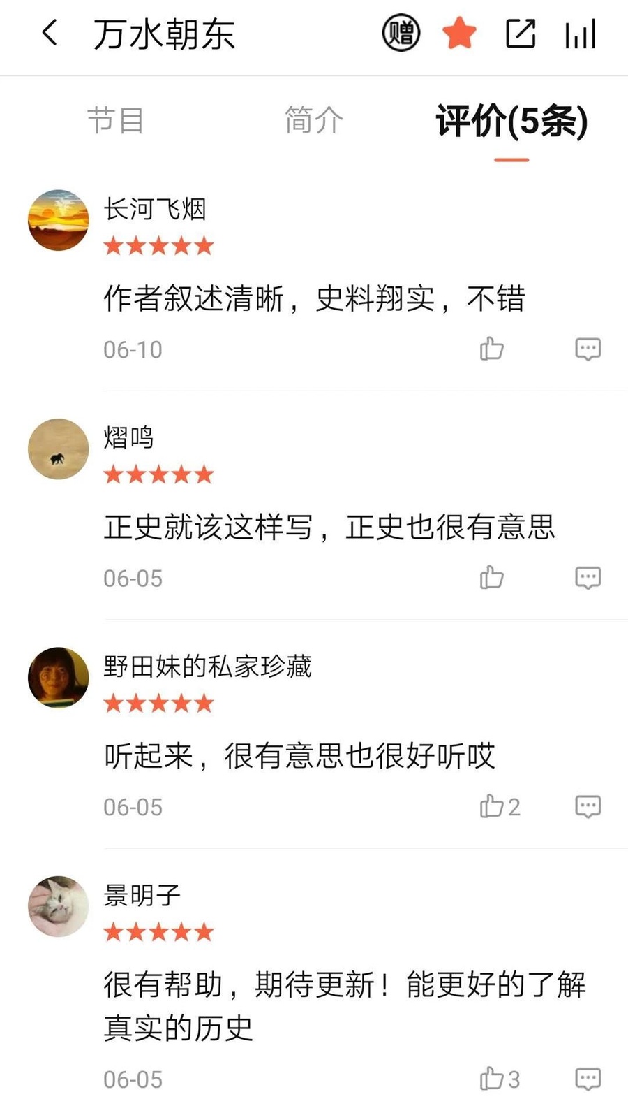 上线以来,《万水朝东》音频专辑得到读者的广泛关注,在评论区也给予高度评价: