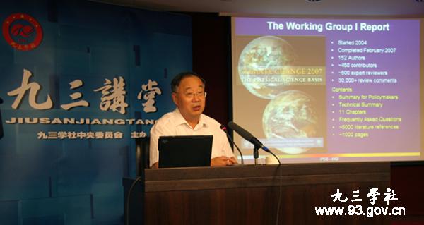 7月10日下午,中国科学院院士、中国气象局原局长、政府间气候变化专业委员会(IPCC)第四次评估报告第一工作组联合主席秦大河做客九三讲堂,做了题为“气候变化:影响与对策”的精彩报告。全国人大常委会副委员长、九三学社中央主席韩启德,九三学社中央副主席邵鸿出席报告会。