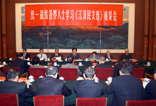 全国政协副主席、中共中央统战部部长刘延东在讲话中阐述了统一战线学习《江泽民文选》的重要意义,从10个方面对江泽民同志的统一战线思想作了集中概括。她指出,学习好运用好《江泽民文选》既是中国共产党的重要政治任务,也是统一战线各界人士的重要政治任务。希望各民主党派、工商联、无党派人士和民族宗教界人士等统一战线广大成员按照中共中央的要求,把学习《江泽民文选》与学习马列著作、毛泽东著作、邓小平著作结合起来,与学习以胡锦涛同志为总书记的中共中央关于治国理政的重要战略思想结合起来,与巩固和壮大新形势下最广泛爱国统一战线的实践要求结合起来,努力把对《江泽民文选》的深刻认识,转化为为中国特色社会主义事业不懈奋斗的坚定信念,转化为新世纪新阶段统一战线事业发展的强大动力。要认真学习贯彻全国统战工作会议精神和中央关于统一战线工作的一系列重要文件精神,围绕实现全面建设小康社会奋斗目标,充分发挥智力密集、联系广泛、协调关系、化解矛盾的优势,为实施“十一五”规划、增进社会和谐献计出力。要全面加强自身建设,坚定不移地走中国特色政治发展道路,更好地在建设中国特色社会主义事业中发挥重要作用。