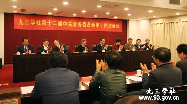 九三学社第十二届中央常务委员会第十四次会议3月6日在京举行。会议审议并通过了《九三学社中央关于学习贯彻十一届全国人大四次会议和全国政协十一届四次会议精神的决议》。九三学社中央主席韩启德主持会议,九三学社中央副主席王志珍、冯培恩、邵鸿、谢小军、张桃林、赖明、马大龙、丛斌出席会议。