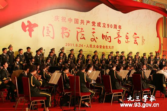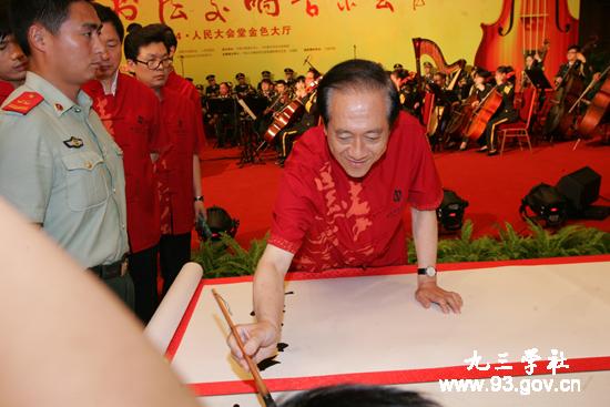 6月24日下午,由中国文联、中国书法家协会、人民画报社主办,中国文联演艺中心协办,人民画报书画院、中国书法家协会艺术发展中心策划、承办,天铭文化传媒独家赞助的 “纪念中国共产党成立90周年——中国书法交响音乐会”在人民大会堂金色大厅隆重举行。全国人大常委会副委员长、九三学社中央主席韩启德,中国文联党组书记赵实,中国文联党组副书记、副主席覃志刚,中国外文局局长周明伟,中国外文局常务副局长郭晓勇,中国外文局副局长陆彩荣,中国书法家协会主席张海,中国书法家协会原顾问欧阳中石,中国书法家协会顾问李铎,中国书法家协会分党组书记、驻会副主席赵长青等领导和社会各界人士共700多人出席。