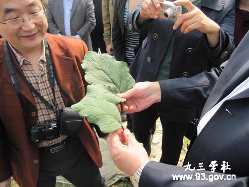 图3:董元华教授摘取两个大棚苗叶,丛斌副主席拿在手中对比