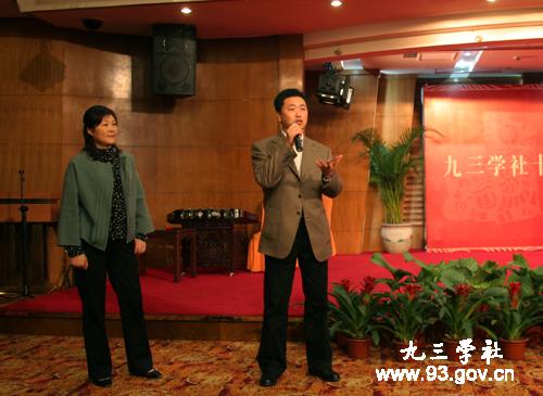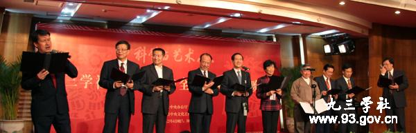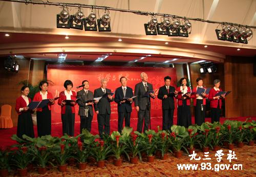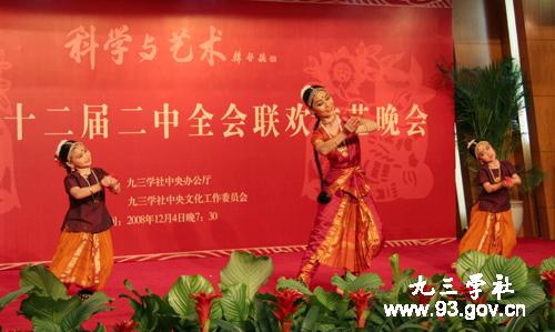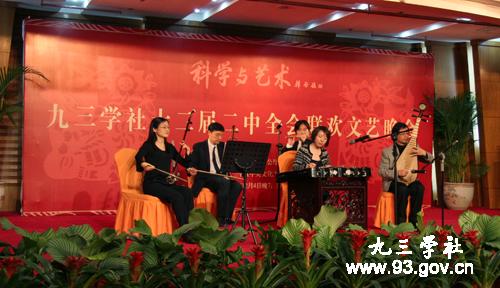 开场合唱是由九三学社北京市委合唱团特地为本次全会赶排的《啊,九三》,悠扬的手风琴伴着舒缓的歌声,演绎出九三学社社员蓬勃昂扬的精气神;未回神,一曲《春天的故事》,献礼改革开放30周年。一袭轻纱,舞姿轻灵,袖袂翻飞,是古典独舞《扇舞丹青》。激扬欢快的旋律、此起彼伏的掌声和欢呼,这是韩启德主席和各位副主席与歌唱家们合作演绎的《我的太阳》和《游击队之歌》。简练诙谐的小诗《今天》,点燃了青春的热、理想的火。京剧清唱《天女散花》,耳中是醉人的唱腔、眼里是绮丽的水袖。一段“意想不到”的原生态之旅开始,将思绪从古代拽回现代,那是让人开怀大笑的相声表演。二胡、高胡、琵琶、笛子、扬琴,民乐五架头上演,《紫竹调》之后《阿细跳月》,乐曲声声,如春风拂柳、和熙怡人。优雅中带着性感,魅惑又不失可爱,印度群舞《欢乐的婆罗多》惊艳全场。九三学社广西区委副主委林繁带来一曲《山歌好比春江水》,九三学社宁波市委主委傅丹的古琴声幽幽,浩渺似塞外黄沙随风荡远。互动点播的轻松一刻,全场清和一段《同一首歌》,引出今晚最让人动容的桥段——来自地震灾区的九三学社绵阳市委主委王瑜和九三学社广元市委主委王玉华,怀着对九三学社大家庭的感恩,言说大灾中的大爱无边,不尽潸然泪下。九三中央机关代表向他们献上鲜花,表达对奋战在一线社员的敬意,温馨感人的画面定格在大家的记忆中。九三学社北京市委老龄委的社员们,虽已白发满头,但精神抖擞,献上守望“天人合一、世界大同”的配乐诗朗诵《和谐之歌》。九三学社上海市委副主委郑祖康激昂一曲,“冰冷的小手”也变得温热。末了,独奏的电子管风琴演绎出硕大排场的乐队效果,仿佛在入夜之前晴光忽放、落日溶金,余音渺渺,让人意犹未尽。