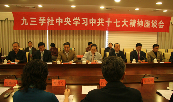 ,学习座谈中共十七大精神。九三学社中央主席韩启德、常务副主席陈抗甫出席会议并讲话。座谈会由九三学社中央副主席邵鸿主持。