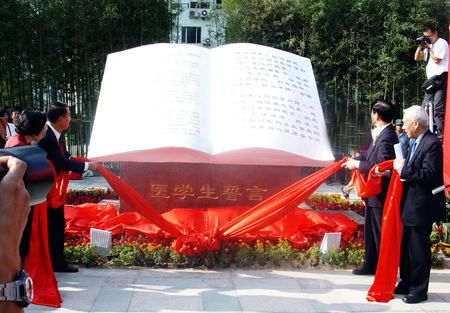 9月24日下午,复旦大学上海医学院福庆路旁大草坪彩旗飞舞,礼花齐鸣。牵动无数医学生心弦的医学生誓言碑在此落成。全国人大常委会副委员长、九三学社中央主席韩启德专程赶来,与复旦大学党委书记秦绍德和陈灏珠、闻玉梅两位院士共同为誓言碑揭幕。