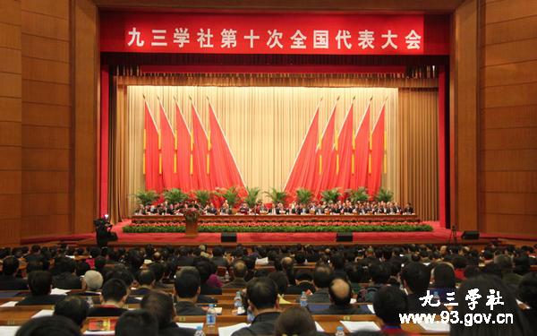 北京京西宾馆大礼堂气氛热烈。主席台上方悬挂着“九三学社第十次全国代表大会”会标,后幕10面鲜艳的红旗分列两侧。二楼眺台上悬挂着“为把我社建设成为一个思想上坚定、履职上坚实、组织上坚强的参政党而奋斗”的横幅。