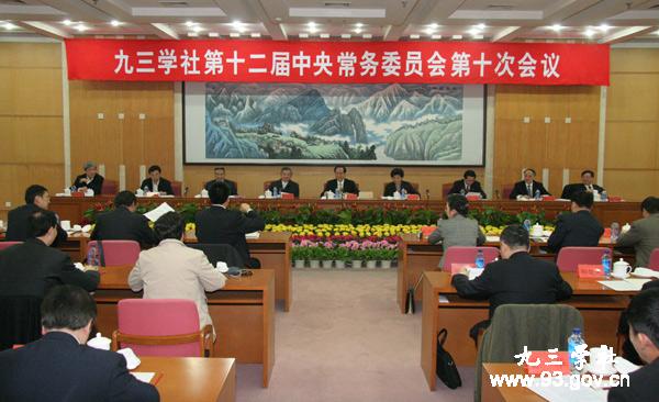 九三学社第十二届中央常务委员会第十次会议3月6日在京举行。会议审议通过了《九三学社中央关于学习贯彻十一届全国人大三次会议和全国政协十一届三次会议精神的决议》。会议由九三学社中央主席会议主持。全国人大常委会副委员长、九三学社中央主席韩启德出席会议并讲话,全国政协副主席、九三学社中央副主席王志珍,九三学社中央副主席冯培恩、贺铿、邵鸿、谢小军、张桃林、赖明、马大龙出席会议。