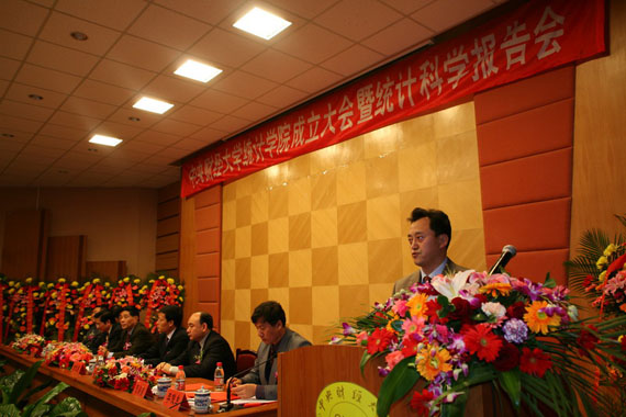 11月18日下午,中央财经大学统计学院成立大会暨统计科学报告会在中财大主教学楼学术报告厅举行。全国人大常委会副委员长、九三学社主席韩启德向大会发来了贺信。九三学社中央副主席贺铿出席大会并从中央财经大学校长王广谦手中接过了受聘担任中财大首届统计学院院长的聘书。贺铿在讲话中代表中财大统计学院对有关单位的领导、兄弟院校的专家学者等的支持表示感谢。贺铿指出,中财大统计学院的成立有利于现代统计科学在中国的发展,有利于促进财经类其它学科的现代化,有利于统计理论与统计实践的密切结合。统计学院将加强与有关部门、院校的合作,力争把中央财经大学统计学院办成全国一流、有国际影响的统计学院。