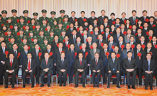 中共中央、国务院和中央军委12月20日上午在北京人民大会堂举行大会,隆重庆祝我国探月工程嫦娥2号任务圆满成功。二排左五为严俊