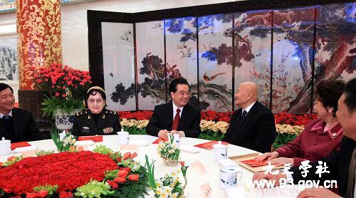 图为胡锦涛总书记在晚会上与九三学社中央原顾问、中科院和工程院院士、金属学及材料科学家师昌绪亲切交谈。