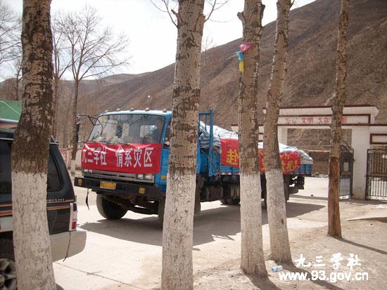 广场上车水马龙。从批发市场提出的白菜、萝卜、甘蓝、黄瓜、洋芋等蔬菜装满了两辆货车。车身上“九三学社 情系灾区”、“九三学社青海省委、西宁市委援助玉树灾区救援队”的大字条幅在阳光映衬下格外醒目,引得许多行人驻足观看,目光中带着几多赞许。