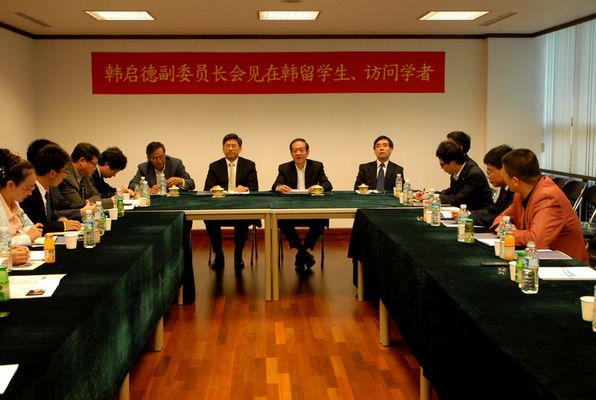 17日,韩启德在首尔中国文化中心亲切会见了在韩留学生、交换学者代表,就我国引智政策和现状进行了座谈。韩启德认真听取同学们的发言后发表讲话,就大家共同关心的国家鼓励出国留学和留学人员回国就业、创业等话题进行了交流,指出作为人才培养的重要渠道,国家会继续大力鼓励和支持出国留学,并为学成人员回国就业、创业提供便利条件。韩启德勉励大家要树立远大理想和正确的人生观、价值观,进一步刻苦学习,积累知识,掌握本领,力争把自己培养成尖子人才,为国家科技进步和社会发展贡献青春和才智。