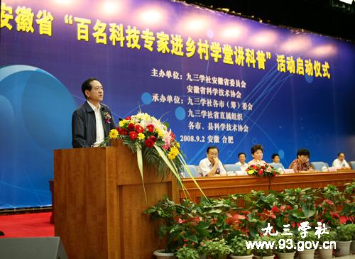 9月2日,由九三学社安徽省委与安徽省科协联合主办的“百名科技专家进乡村学堂讲科普”活动启动仪式在合肥举行。全国人大常委会副委员长、九三学社中央主席、中国科协主席韩启德在仪式上指出,九三学社安徽省委与安徽省科协组织科技专家深入农村开展科普讲座,探索了科技工作者服务社会的新机制。韩启德为“安徽省科技专家志愿团”授旗并宣布活动正式启动。