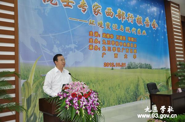 10月21日,由九三学社中央主办,九三学社广西区委、广西大学承办,以“环境变迁与现代农业”为主题的“九三学社院士专家西部行”报告会在南宁市广西大学图书馆报告厅隆重举行。自治区政协副主席、九三学社中央常委、广西区委主委李彬出席报告会并讲话。报告会由广西大学副校长陈保善主持。