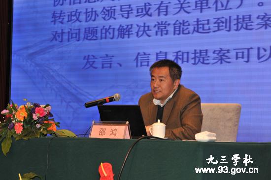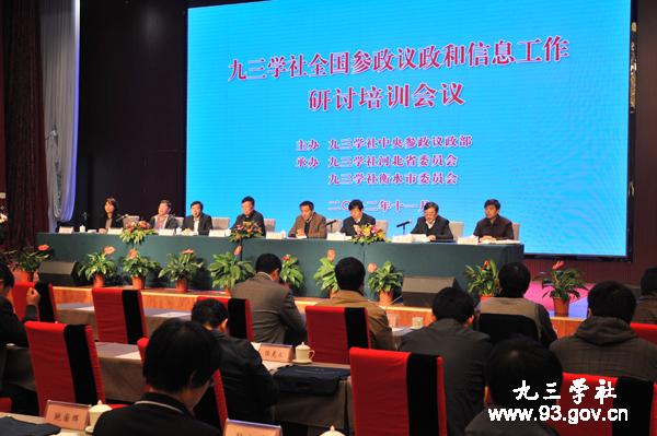 2012年11月6日至10日,九三学社全国参政议政和信息工作研讨培训会议在河北衡水市召开。会上,全国政协常委、全国政协提案委员会副主任、九三学社中央副主席邵鸿作了题为《怎样做好政协提案建议》的专题培训报告,全国政协常委、九三学社中央副主席赖明作了题为《关于做好参政议政工作的几点思考》的专题培训报告,九三学社中央参政议政部部长郭悦、副巡视员张瑛分别布置了有关工作,与会人员观看了十八大开幕式并就报告进行了分组讨论。九三学社中央参政议政部、社各省级组织参政议政和信息工作负责人100余人参加了会议。