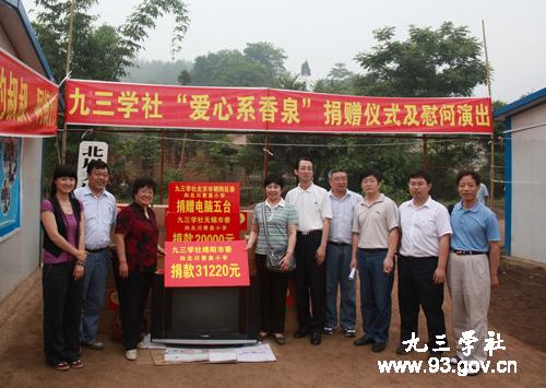 演出中,九三学社北京市朝阳区委、江苏省无锡市委、四川省绵阳市委分别代表三市(区)委2000多名九三社员向香泉小学的学生捐款、捐物。