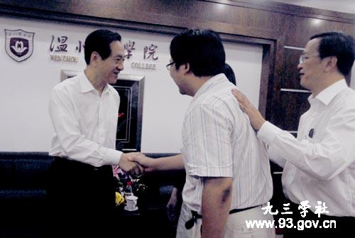 九三学社温州市委副主委周健民以及项如莲、姜丽萍、林锡芳等先后向韩启德汇报了九三学社温州市委和九三学社温州医学院委员会的有关情况。在了解到九三学社温州医学院委员会近年来自身建设不断加强,社员队伍不断壮大的介绍后,韩启德十分高兴,他充分肯定了九三学社温州医学院委员会的工作成绩,并勉励大家立足本职、爱岗敬业,为单位的建设、为九三学社的发展作出更大贡献。