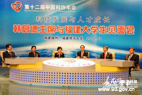 11月1日下午,全国人大常委会副委员长、中国科协主席、九三学社中央主席韩启德在福州与福建大学生进行了主题为“科技发展与人才成长”面对面的交流座谈。来自福建师范大学、福州大学、福建农林大学、福建医科大学、福建中医药大学、福建工程学院、闽江学院和江夏学院等8所高校的200多名学生参加了见面会。见面会由省委常委、副省长陈桦主持。省领导王美香、洪捷序出席见面会。