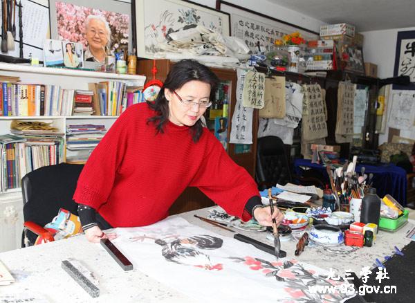 困难比想象的要大的多。她是右侧偏瘫,只能用用左手学习书画。大家不妨体会一下用左手握着毛笔的感觉。何况她右侧身体僵硬得无法控制,从站在画桌前到坐下把文房四宝准备好就要用接近一个小时的时间。因为偏瘫的病理反映,她身体右侧的张力过高,右臂在桌前无规则地晃动,左手难以在纸上下笔,不是右手把宣纸捅破,就是把桌上的墨盒打翻,东西掉在地上。完成一幅作品后,颜色竟然涂了满脸……