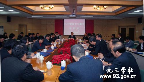 10月28日至29日,九三学社中央委员培训班在中央社会主义学院举办。这次培训的主题是学习中国特色社会主义理论体系,坚定走中国特色社会主义政治发展道路的信念;同时结合社九大提出的各项任务研讨如何进一步发挥中央委员的作用。全国人大常委会副委员长、九三学社中央主席韩启德、全国政协副秘书长、九三学社中央常务副主席陈抗甫出席培训班为学员 授课并与学员亲切座谈。九三学社中央副主席赖明、中央社会主义学院副院长张峰分别就相关专题为培训班学员做了辅导讲解。