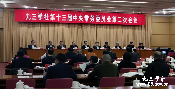 九三学社第十三届中央常务委员会第二次会议3月4日晚在北京举行。会议审议通过了《九三学社中央关于学习贯彻十二届全国人大一次会议和全国政协十二届一次会议精神的决议》。会议决定,九三学社第十三届中央委员会设立经济、科技、农林、教育文化、社会建设、法律、医药卫生、人口资源环境等8个专门委员会;院士、文化、海外联络、妇女、科普等5个工作委员会。会议审议通过了《九三学社中央专门委员会和工作委员会主任、副主任建议名单》。会议还研究了九三学社中央十三届三次常委会筹备工作,并向荣获九三学社2011—2012年度新闻宣传工作先进单位颁奖。九三学社中央主席韩启德主持会议并讲话。九三学社中央常务副主席邵鸿,副主席谢小军、张桃林、赖明、马大龙、丛斌、赵雯、武维华、印红出席会议。