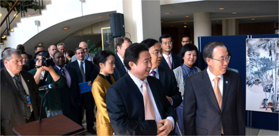 联合国秘书长潘基文和各国驻联合国大使们观看王林旭的超象艺术作品